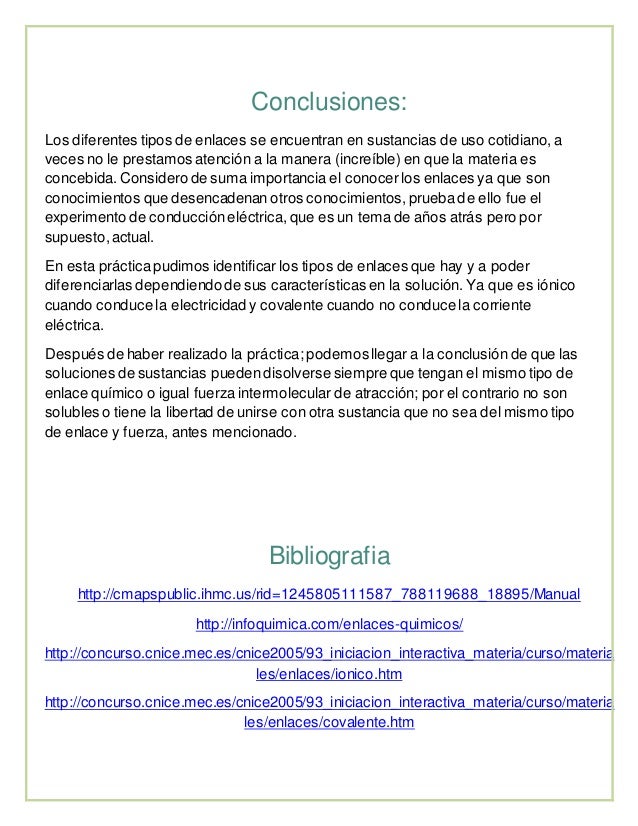 Conclusiones de enlace quimico 25557 Anuncio CONCLUSIN. Ilustración 1 Enlace covalente de la molécula del agua. El siguiente trabajo habla sobre los procesos de enlaces iónicos y covalentes realizado en la práctica anterior de laboratorio explicando cada una de las. Reporte De La Práctica 2 - Enlaces Químicos - Final. Reconoce los electrolitos fuertes débiles y no electrolitos.